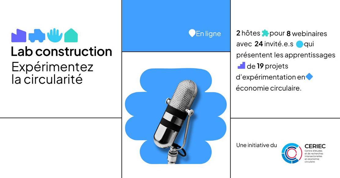 L’équipe du Lab construction du Centre d’études et de recherches intersectorielles en économie circulaire (CERIEC) rend disponible sur sa chaîne YouTube une série de 8 webinaires pour apprendre comment intégrer l’économie circulaire à sa pratique.