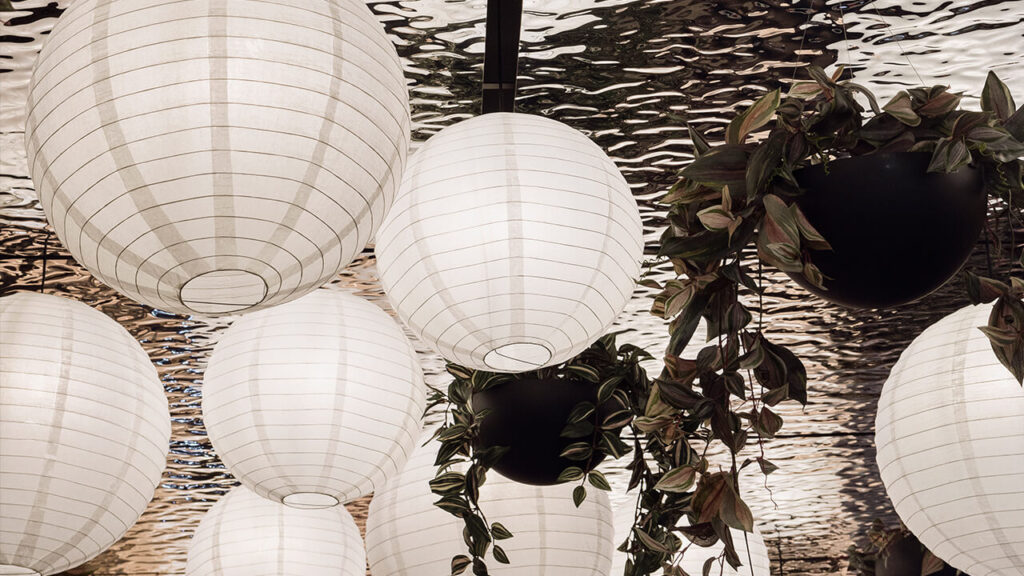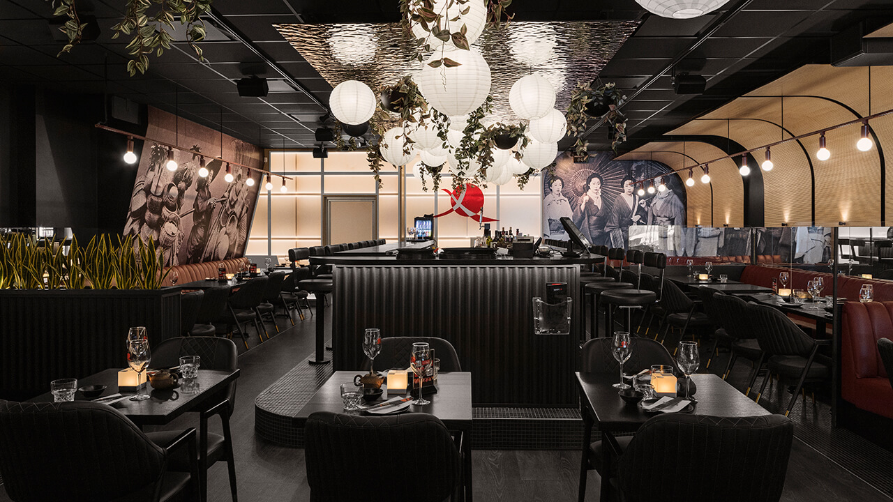 Le bar, inspiré des brasseries Isakaya, devient la pièce centrale autour de laquelle les aménagements s’organisent. Une série d’éléments architecturaux inspirés du monde culinaire nippon deviennent des pièces signatures : les revêtements muraux et les retombées en baguettes de bois rappellent la texture des tapis à rouler des sushis, et la conopée en métal ondulé évoque les réputés couteaux japonais. Au fond, le mur rétro-éclairé produit une lumière douce et tamisée, mimant l’effet du papier de riz. Au plafond, l’abondance des lanternes en papier et la végétation tombante apportent chaleur et convivialité aux espaces.