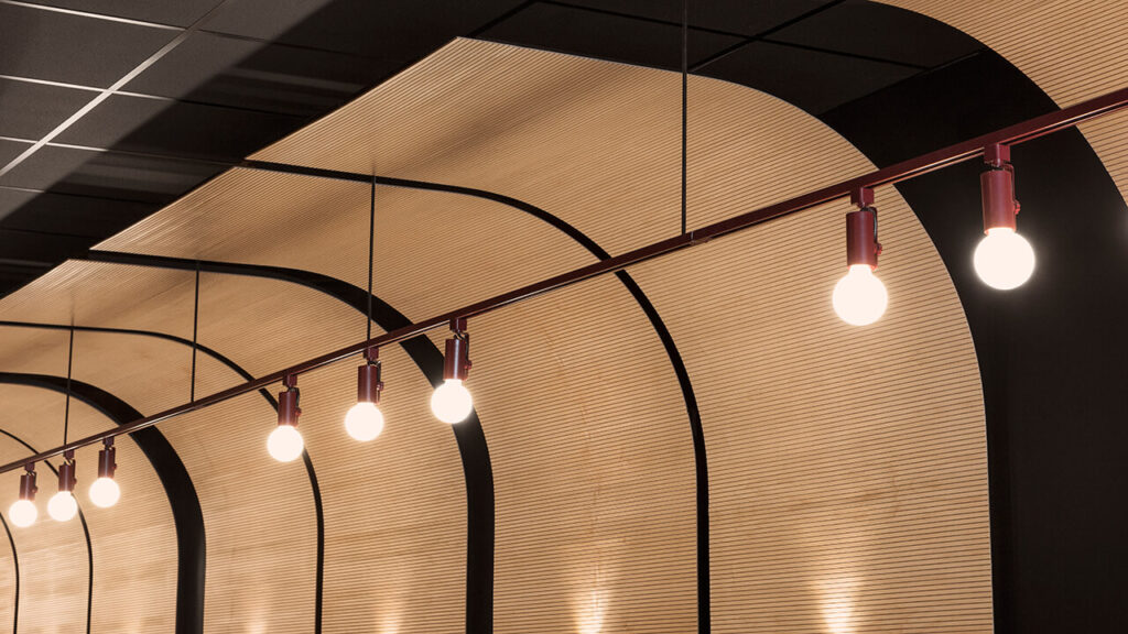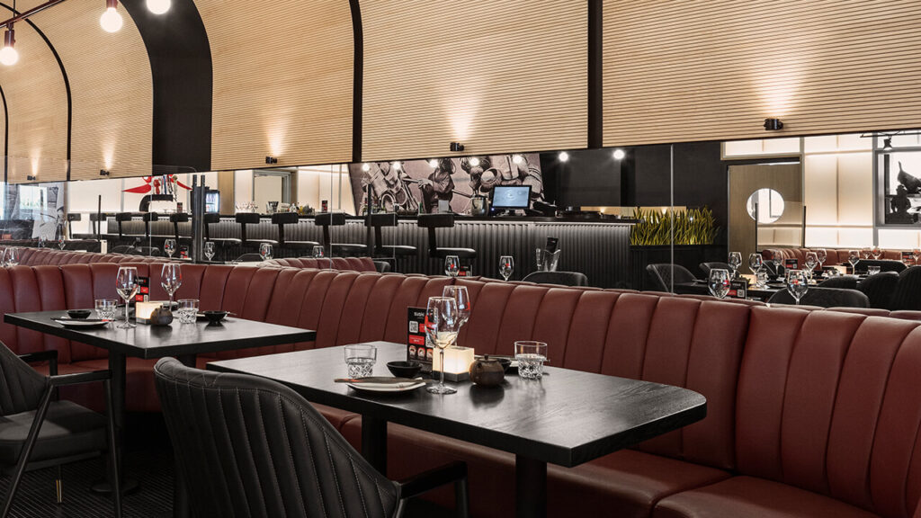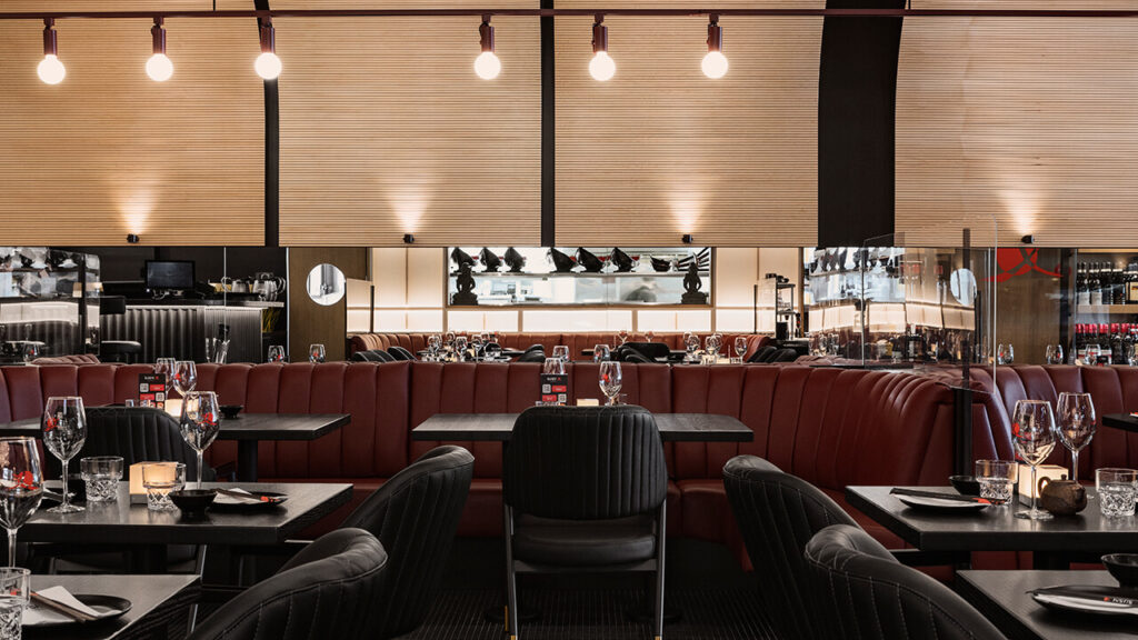 Les retombées incurvées en bois ajoutent une touche d’intimité et de convivialité, alors que les imprimés géants enrichissent et personnalisent l’espace. Le jeu de miroir au-dessus des banquettes, quant à lui, modifie complètement l’expérience du client, lui permettant de suivre discrètement l’action dans l’ensemble du restaurant.