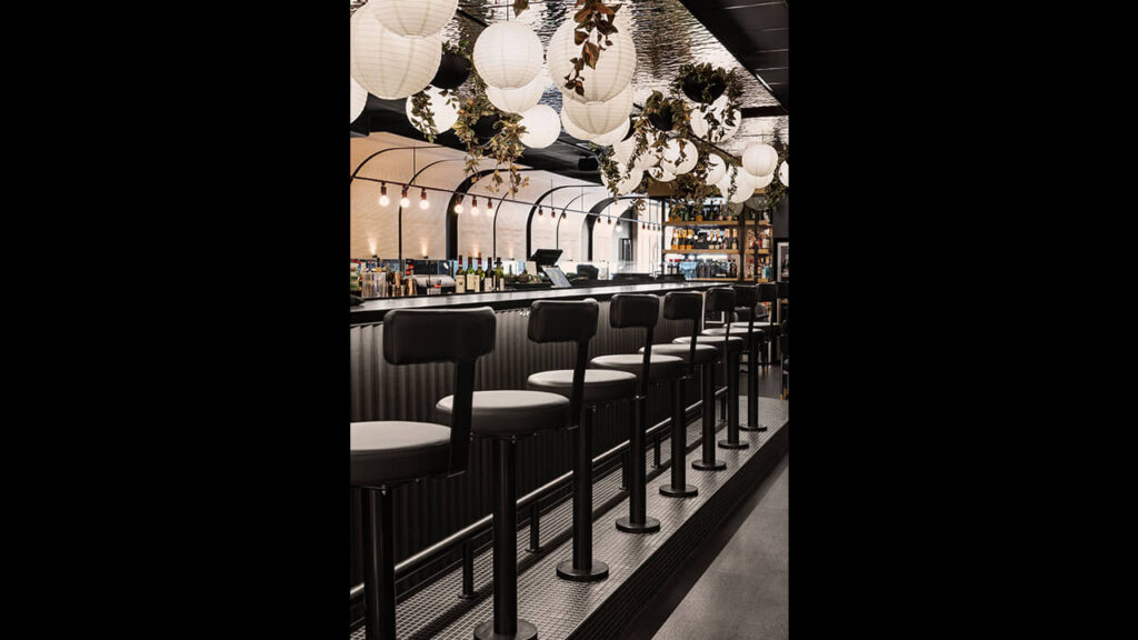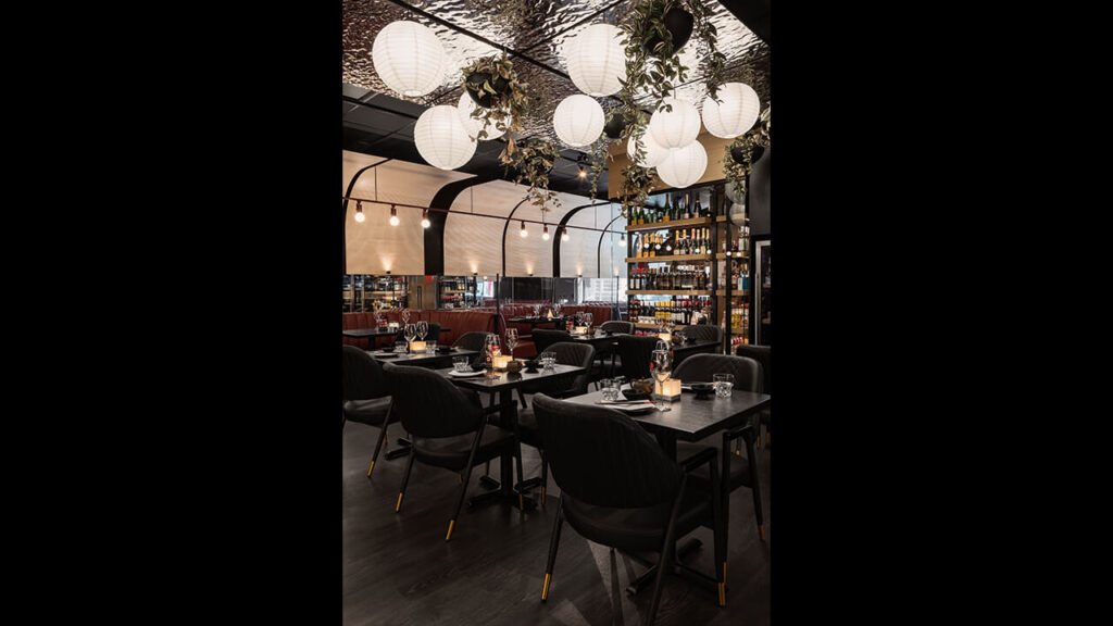 Bravo également pour avoir résisté à la tentation de recouvrir le plafond de gypse. Le choix actuel, une surface acoustique noire texturée, saura atténuer le niveau de bruit, un élément souvent négligé dans le design de bars et restaurants.