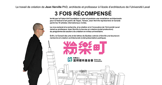 « Récemment invité par la Fubon Art Foundation, l’architecte Jean Verville représentera le Canada parmi les dix artistes internationaux appelés à créer et produire une installation architecturale pour le festival d’art public de Taipei à Taiwan.