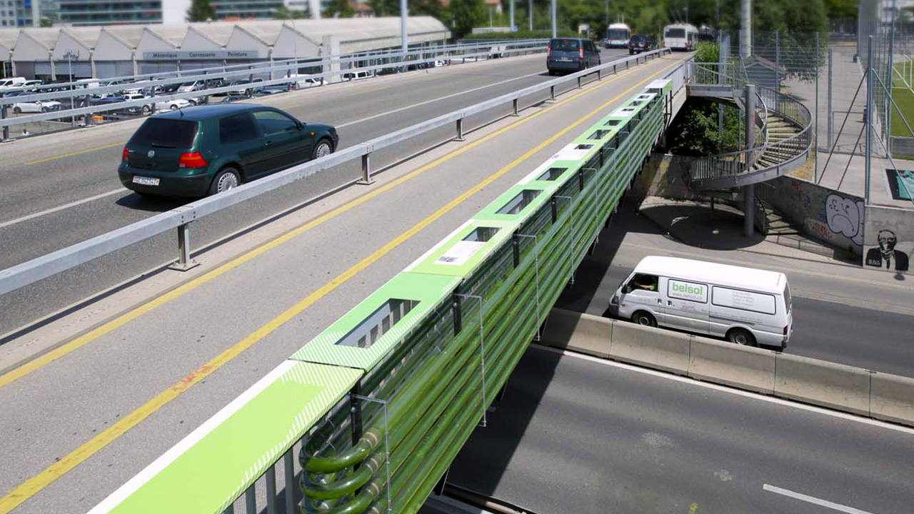 Désirant profiter de l’abondance de lumière naturelle aux abords du réseau routier, le groupe a attaché à un viaduc un circuit de tubes transparents à l’intérieur duquel il est possible de produire des algues grâce à l’énergie solaire.
