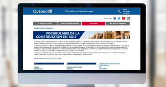 « La construction en bois a énormément évolué au cours des dernières années, tout comme son vocabulaire pour s’adapter à ses avancées en matière d’ingénierie et de produits du bois. L’Office québécois de la langue française (OQLF) a donc travaillé en collaboration avec différents acteurs du milieu afin d’élaborer les mots et les significations utiles à la compréhension des spécialistes et du public. »