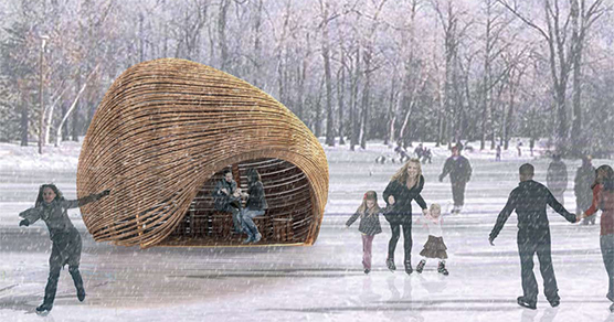 On doit l’expression Warming Huts à l’architecte de Sputnik Architecture, Peter Hargreaves, et à son expérience intime avec des conditions météorologiques subarctiques près de Winnipeg. Dans la capitale du Manitoba, les hivers peuvent s’étendre jusqu’à 6 mois et descendre sous des températures de -40 C. Hargreaves a réalisé non seulement la nécessité, mais l’opportunité d’organiser un concours – suivi d’une exposition – pour des abris temporaires qui répondent à ce climat intransigeant. En plus des trois gagnants, l’édition 2012 a mobilisé une équipe de l’architecte Frank O. Gehry, ainsi que des étudiants de l’Université du Manitoba, tous invités à présenter une installation. Chaque hutte, ou installation devait entrer dans un budget de 16 500 $ CAD. Concours sans programme préalable, les projets ont été évalués en fonction de : «l’utilisation des matériaux, la fourniture des abris, la poétique de l’assemblage et de la forme, l’intégration dans le paysage, et la facilité de construction». »
