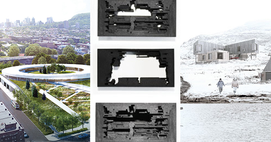 FROM LEFT TO RIGHT : Winning projects from Québec : Bellechasse Transport Centre / Lemay (Award of Merit) | Free / Open Source City / Samuel Gendron Fortier, Université de Montréal (Student Award of Excellence) | From Matter to Place / Pierre-Olivier Demeule, Université Laval (Student Award of Excellence)