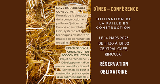 « La construction en paille pique votre curiosité? Le Créneau Écoconstruction, en collaboration avec le SEREX, présente un dîner-conférence sur l’utilisation de la paille dans la construction le 14 mars prochain de 11h30 à 13h30 au Central café, à Rimouski.
