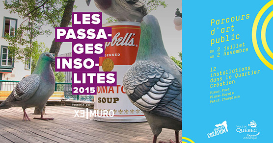 « Forts de leur succès de l’an dernier, les Passages Insolites 2015 présentent du 2 juillet au 2 novembre 12 œuvres d’art public d’artistes en arts visuels et de collectifs d’architecture, dans les secteurs du Vieux-Port, de Place-Royale et du Petit-Champlain. Présenté par la Ville de Québec et réalisé par EXMURO arts publics, le parcours libre et gratuit, facilement accessible à pied, plaira aux petits et grands.