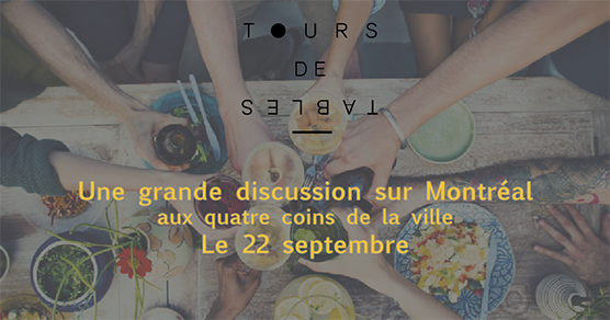 « Le jeudi 22 septembre, 50 Montréalais recevront chez eux d’autres Montréalais afin d’échanger sur la manière dont ils perçoivent leur ville et voudraient la voir évoluer. La Soirée Tours de tables se veut un événement rassembleur qui suscitera des rencontres inusitées puisque l’équipe d’Amplifier Montréal s’occupe de jumeler hôtes et invités, mais aussi une soirée amusante et constructive durant laquelle les participants sont appelés à discuter des enjeux Montréalais à l’aide d’un activité ludique conçue par Atelier 10. Pour cette première édition, les fruits de ces discussions seront remis à LA SERRE – arts vivants afin d’inspirer les 12 artistes de leur projet POSSIBLES.