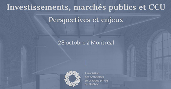 « Le 28 octobre prochain à Montréal, l’AAPPQ propose aux architectes, ingénieurs et urbanistes une matinée de conférences et de réseautage sur le thème Investissements, marchés publics et CCU : perspectives et enjeux.