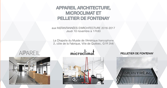 « L’École d’architecture de l’Université Laval est heureuse de vous convier à la prochaine conférence d’Appareil architecture, Microclimat et Pelletier de Fontenay architectes.