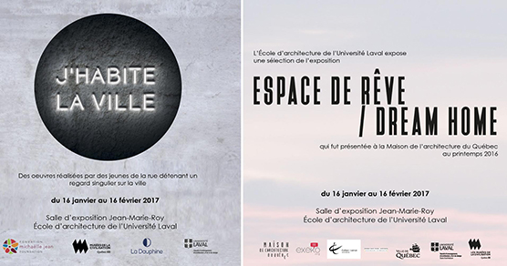 « L’École d’architecture de l’Université Laval a le plaisir d’annoncer que l’exposition J’habite la ville – conjointement avec une sélection de l’exposition Espace de rêve – sera présentée à la salle Jean-Marie-Roy du 16 janvier au 16 février 2017. L’exposition sera ouverte au public à tous les jours de 8h à 18h.