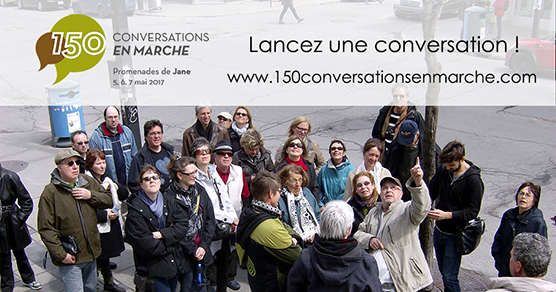 Les Promenades de Jane sont de retour les 5, 6 et 7 mai 2017. 150 conversations en marche seront tenues dans le cadre du 375e de Montréal et du 150e anniversaire de la Confédération du Canada. Le Centre d’écologie urbaine de Montréal (CEUM) vous invite à contribuer à cette programmation entièrement citoyenne, en organisant l’une des 150 promenades prévues. Parlez-en également autour de vous pour nous aider à mobiliser encore plus citoyens comme vous!