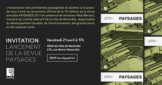 « L’Association des architectes paysagistes du Québec a le plaisir de vous inviter au lancement officiel de la 12e édition de la revue PAYSAGES 2017 sous le thème: « Architectes paysagistes: concepteurs de milieux de vie », en présence de monsieur Réal Ménard, membre du comité éxécutif de la Ville de Montréal, responsable du développement durable, de l’environnement, des grands parcs et des espaces verts.