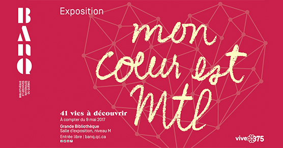 « Montréal, le 8 mai 2017 – Conçue et réalisée par Bibliothèque et Archives nationales du Québec (BAnQ) pour souligner le 375e anniversaire de la ville de Montréal, l’exposition Mon cœur est Montréal – 41 vies à découvrir est présentée à la Grande Bibliothèque à compter du 9 mai 2017. Traçant le portrait d’hommes et de femmes qui ont façonné la ville, de Jeanne Mance (1606-1673) à François Barbeau (1935-2016), l’exposition révèle au moyen de documents patrimoniaux des signes du passage de ces personnes dans la grande cité sur le fleuve.