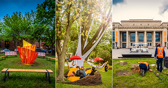 DE GAUCHE À DROITE: Installation « Quiétude rustique » @ Station Villeray par Coop Les Vivaces | Installation « L’art de chiller » @ Station Saint-Michel par Christophe Garoscio et Andréa Cohen | Installation « Cabaret urbain » @ Station Parc-Extension par L. McComber — architecture vivante