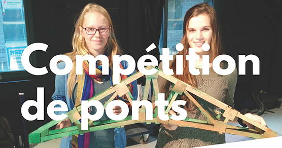 « Vous êtes invités à assister à la 26 ième édition de la compétition de ponts du département de génie civil du Collège Limoilou. La construction des ponts est réalisée à partir de lamelles de bois collées les unes aux autres. Les ponts doivent permettre de parcourir une portée de 1,5 mètres et résister à une charge maximale à la rupture.