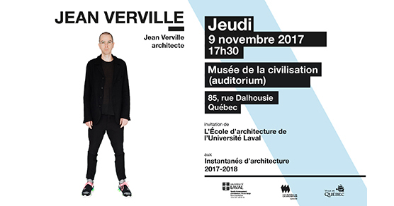 L’École d’architecture de l’Université Laval est heureuse de vous inviter le jeudi 9 novembre 2017 à 17h30 à la conférence de Jean Verville (Jean Verville architecte, Montréal) dans le cadre de la série Instantanés d’architecture. La conférence aura lieu à l’auditorium du Musée de la civilisation.