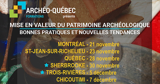 * De plus, les formations de Sherbrooke et de Trois-Rivières seront offertes sous la forme de mini-colloques régionaux offrant le choix entre deux formations suivies d’un 5 à 7 de réseautage ; la seconde formation sera présentée par l’archéologue Agnès Gelé sur le thème « Gestion du patrimoine archéologique et aménagement du territoire – Bonnes pratiques de développement durable ».