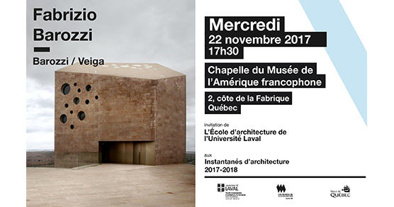 L’École d’architecture de l’Université Laval est heureuse de vous inviter le mercredi 22 novembre 2017 à 17h30 à la conférence de Fabrizio Barozzi (Barozzi / Veiga, Barcelone) dans le cadre de la série Instantanés d’architecture. La conférence aura lieu à la Chapelle du Musée de l’Amérique francophone.
