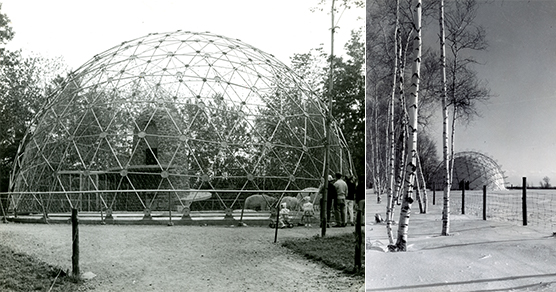 À GAUCHE: Habitat d’ours polaires du zoo de Granby, Granby, QC, 1963. Paul-O. Trépanier et Victor Prus. Société d’Histoire de la Haute-Yamaska. | À DROITE: « Weatherbreak », dôme géodésique assemblé à Baie d’Urfé, QC, décembre 1950. Fonds Jeffrey Lindsay, Archives d’architecture canadienne, Université de Calgary. Jeffrey Lindsay, photographe.