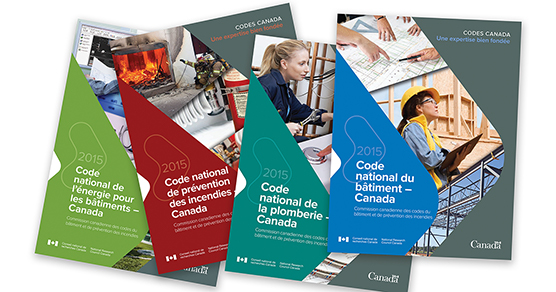 Pages couvertures du Code national du bâtiment – Canada 2015, Code national de prévention des incendies – Canada 2015, Code national de la plomberie – Canada 2015 et du Code national de l’énergie pour les bâtiments – Canada 2015