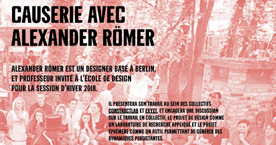 Il présentera son travail au sein des Collectifs Constructlab et Exyzt, et engagera une discussion sur le travail en collectif, le projet de design comme un laboratoire de recherche appliqué et le projet éphémère comme un outil permettant de générer des dynamiques persistantes. »