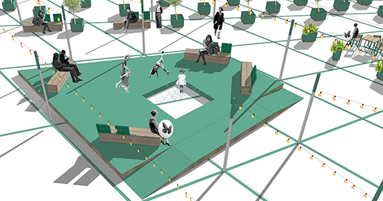 Le premier aménagement se veut rassembleur et favorisera la rencontre et le partage. Un îlot central permettra cette interaction autour des brumisateurs centraux. Des guirlandes lumineuses viendront baliser les sentiers et les zones autour de l’îlot, créant ainsi un ciel lumineux le soir.