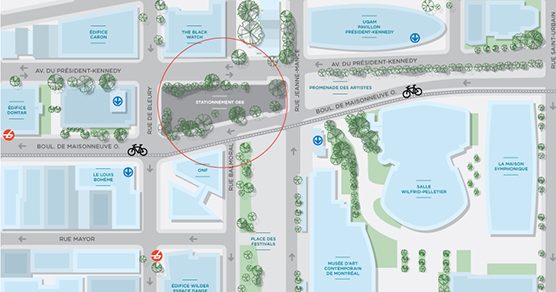 « Le CEUM collabore avec l’arrondissement de Ville-Marie au processus de codesign pour la transformation du terrain de stationnement no 066. Exploité par Stationnement de Montréal, le terrain no 066 est situé au nord de la place des Festivals dans le boulevard De Maisonneuve Ouest, entre les rues De Bleury et Jeanne-Mance.