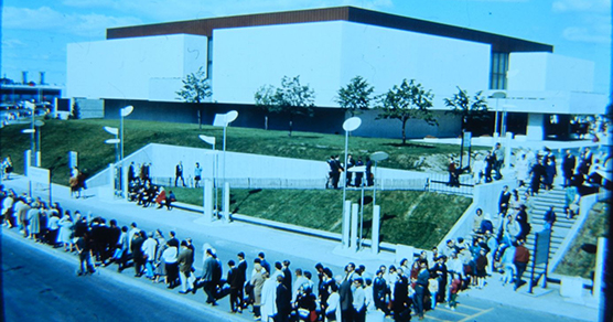 Unknown photographer, View of the Man the Creator Pavilion with visitors standing in line at a trailer train stop in foreground, Expo 67, Montréal, Québec, Colour Slide, Collection Canadian Centre for Architecture, Montréal; Gift of May Cutler | Photo courtesy of the CCA.
