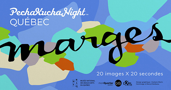 Cette fois, c’est sous le thème « MARGES » que ces personnalités bien connues ou émergentes de la grande région de Québec relèveront le défi d’offrir au public une présentation visuelle et oratoire de leur travail en 6 minutes 40 secondes, tout en respectant la séquence rythmée de 20 images X 20 secondes chacune.