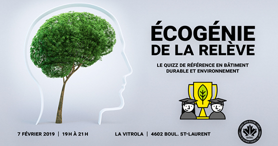 « Envie de mesurer tes connaissances en matière de développement durable dans les domaines de l’architecture, l’ingénierie, l’urbanisme et l’environnement? Les Bâtisseurs écologiques de l’avenir t’invitent à créer ton équipe afin de défier les meilleures universités de Montréal lors de la deuxième Édition du quiz Écogénie de la relève! Tu peux t’inscrire en équipe et jouer, ou seulement t’inscrire individuellement comme spectateur dans l’auditoire et passer une soirée de pur plaisir avec nous!