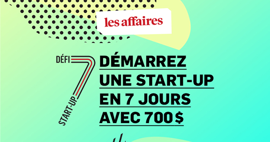 Les Affaires est de retour cette année avec la 4e édition du Défi Start-up 7, un événement pendant lequel les participants, où qu’ils soient au Québec, relèveront le défi de créer une entreprise en 7 jours en y investissant au maximum 700 $. De 7 à 10 finalistes seront ensuite sélectionnés par le jury et le grand gagnant remportera le Grand prix.