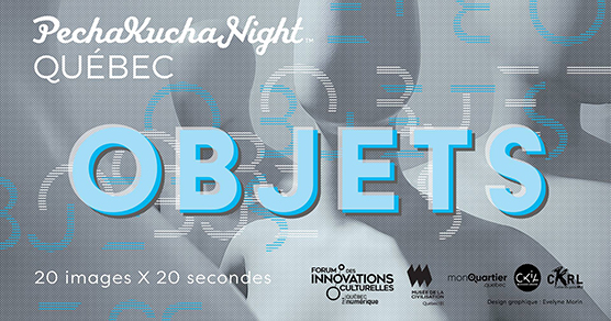 « Dans le contexte de la Semaine numériQC, la thématique OBJETS nous a amenée à explorer l’évolution de l’objet, du réel vers le virtuel. Certains conférenciers aborderont leur travail en lien avec des objets physiques, alors que d’autres feront référence à des objets de plus en plus dématérialisés – et cela, sans oublier la sphère des objets connectés et des possibilités qu’ils ouvrent à la création », explique le responsable du comité de programmation de PechaKucha Québec, Raymond Poirier.