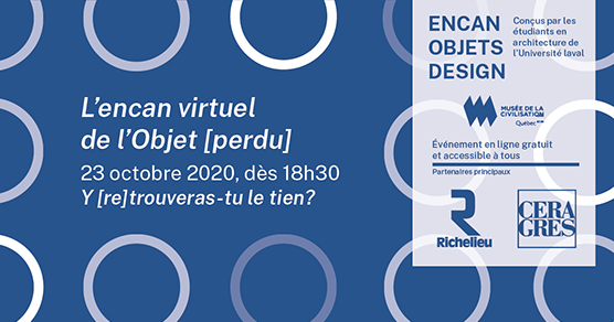 L’Objet perdure depuis presque 30 ans déjà et ce n’est certainement pas 2020 qui mettra fin à cette tradition importante dans le milieu de l’architecture à Québec. L’événement du 13 mars dernier ayant dû être reporté, c’est maintenant avec un enthousiasme renouvelé que le comité vous invite à sa toute première soirée virtuelle de l’encan de l’Objet le vendredi 23 octobre prochain à 18h30! Rendez-vous sur notre chaîne Youtube Objet ulaval dès 18h30!