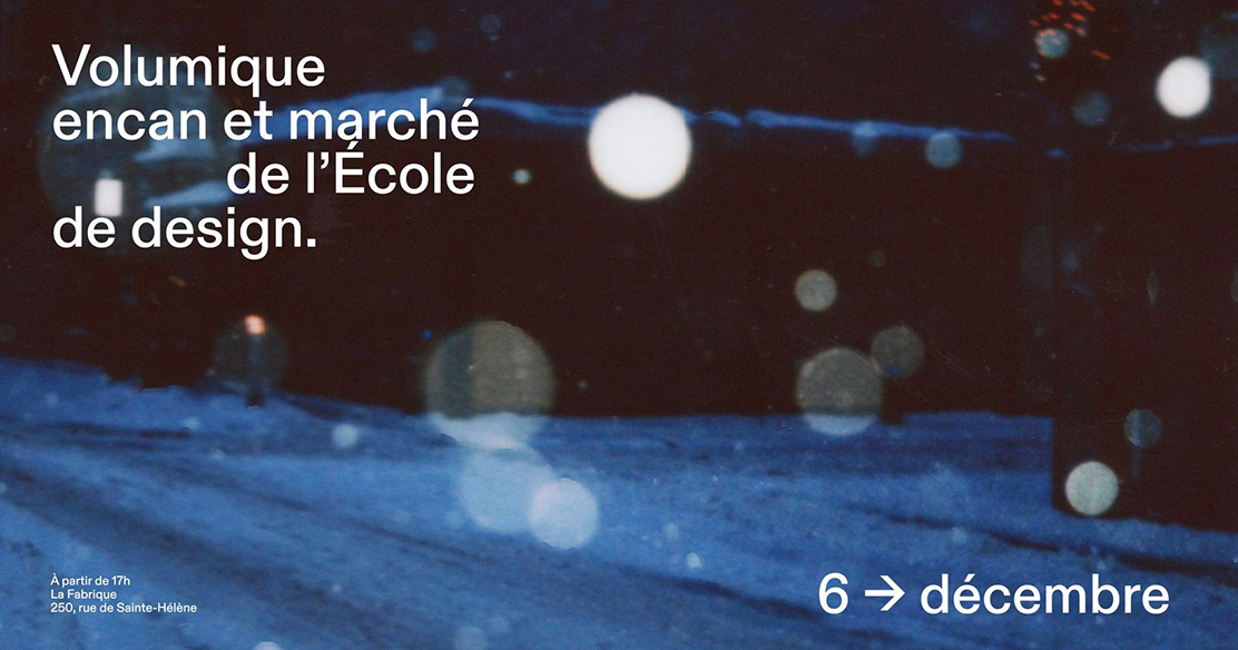 « Québec, le 27 novembre 2023 — La communauté étudiante finissante des baccalauréats en design graphique et en design de produits de l’École de design de l’Université Laval vous invite à la 8e édition de Marché Volumique le 6 décembre prochain, de 17h à 21h dans l’atrium de l’édifice La Fabrique. Ce rendez-vous annuel festif permettra au grand public de se procurer à prix modeste des objets conçus pour l’occasion – conception unique ou en série limitée – et de contribuer au financement de l’événement PREMIÈRE EXPO, qui clôturera au printemps le parcours de ces jeunes talents.