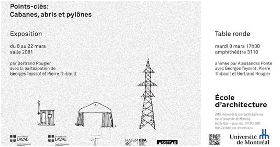 Points-clés : cabanes, abris, pylônes, Commissaires : Bertrand Rougier, avec Georges Teyssot et Pierre Thibault, 8 mars – 22 mars 2016, Université de Montréal, Faculté de l’Aménagement, École d’architecture, 2940 Chemin de la Côte-Sainte-Catherine, Montréal (Québec) H3T 1B9