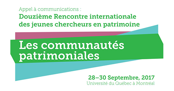 La Chaire de recherche du Canada en patrimoine urbain invite les jeunes chercheurs à soumettre une proposition de communication dans le cadre de la Douzième Rencontre internationale des jeunes chercheurs en patrimoine, qui se tiendra à l’Université du Québec à Montréal (UQAM) du 28 au 30 septembre prochain sous le thème des communautés patrimoniales.