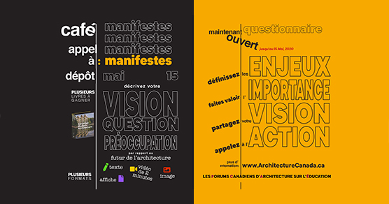 « Les Forums canadiens d’architecture sur l’éducation / The Canadian Architecture Forums on Education (CAFÉ) lancent un dernier appel de manifestes et de rétroaction d’étudiants et d’éducateurs en architecture. Au cours de la dernière année, l’initiative a recueilli des commentaires sur les efforts visant à créer une politique nationale d’architecture pour le Canada par le biais d’une série de forums et d’ateliers publics.