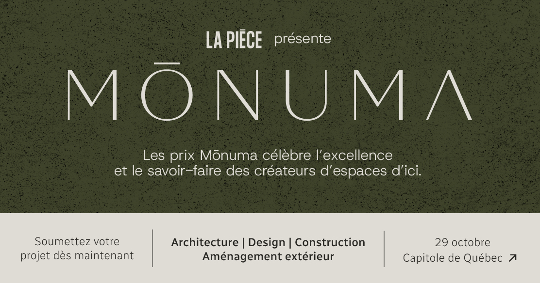 Montréal, le 23 avril 2025 – Le design, l’architecture, l’aménagement extérieur et la construction auront désormais leur grand rendez-vous annuel : le gala MŌNUMA, dont la toute première édition se tiendra le 29 octobre prochain, au prestigieux Théâtre Capitole de Québec, en marge de l’Expo Design. Présenté par La Pièce, MŌNUMA est une célébration de l’excellence et du savoir-faire québécois des designers, des architectes, des architectes paysagistes, des spécialistes en aménagement extérieur et des entrepreneurs en construction.