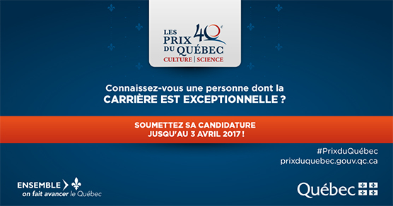 « Québec, le 3 février 2017. – Le gouvernement du Québec annonce la publication de l’appel de candidatures pour la 40e édition des Prix du Québec. Jusqu’au 3 avril prochain, les organisations ainsi que les citoyennes et citoyens sont invités à proposer des candidatures à ces prix qui représentent la plus haute distinction décernée par le gouvernement, en reconnaissance d’une carrière remarquable dans les domaines culturels et scientifiques.