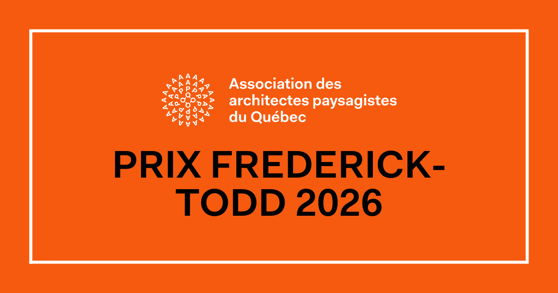 « Montréal, le 20 novembre 2025 — L’Association des architectes paysagistes du Québec (AAPQ) lance officiellement son appel à candidatures pour les Prix Frederick-Todd 2026, une distinction honorifique qui souligne des contributions exceptionnelles à l’essor de l’architecture de paysage au Québec.