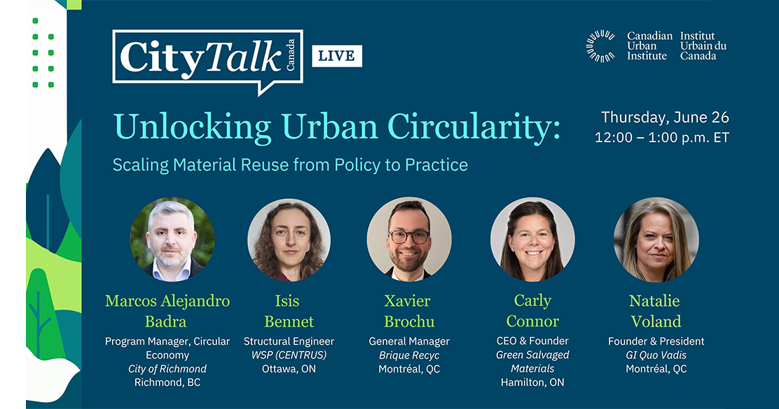 This discussion will explore how leaders across sectors are driving this transformation. From innovative architects and engineers designing for disassembly, to municipal officials shaping enabling policies, to material recovery experts building new infrastructure and market pathways—Canada’s cities are beginning to treat buildings and construction materials as renewable resources rather than waste.