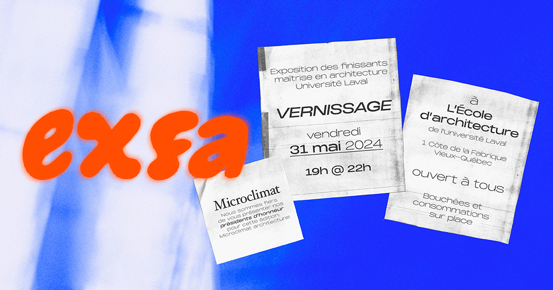 Nous sommes heureux de vous inviter à notre exposition qui souligne et célèbre la fin de cinq années d’études pour plus de 90 finissants à la maîtrise en architecture. Pour un soir, nous vous ouvrons les portes de notre École avec une certaine nostalgie, mais prêts à vous offrir une exposition à notre image. Cette édition de l’ExFA tente d’encapsuler ce qui nous réunit à l’École d’architecture. Reconnaître la chance que nous avons eu de passer de nombreuses années dans un endroit aussi unique et marquant.