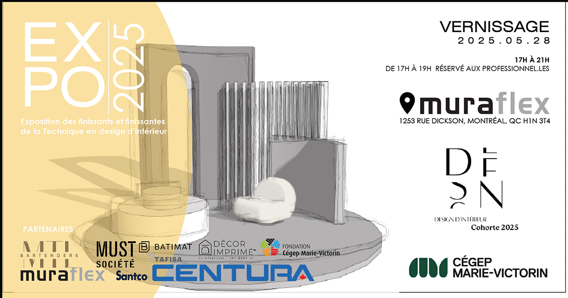 « Le 28 mai prochain, à 17 h, le Département de design d’intérieur du Cégep Marie-Victorin présentera le Vernissage des personnes finissantes où seront dévoilés leurs projets de fin d’études, ce qui marquera l’aboutissement de leur parcours collégial.