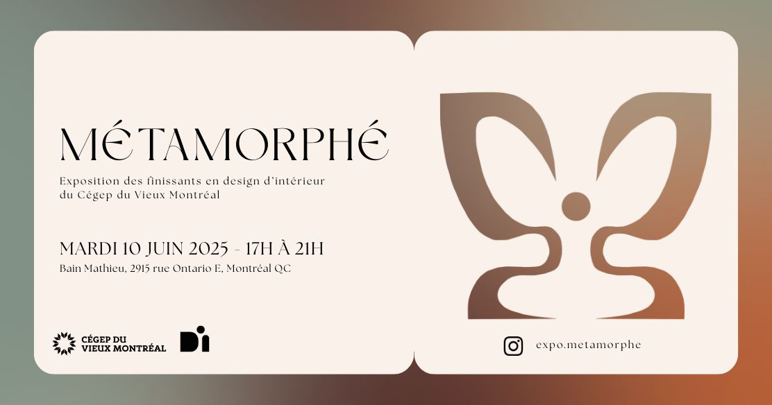 « Le Cégep du Vieux Montréal est fier d’annoncer l’exposition annuelle des finissants en design d’intérieur, une vitrine exceptionnelle des projets réalisés par les étudiants du programme de design d’intérieur, qui se tiendra prochainement au Bain Mathieu. Cet événement met en lumière la créativité et l’innovation des futurs professionnels du domaine, qui présenteront leurs projets de synthèse réalisés au terme de trois années d’études intensives.