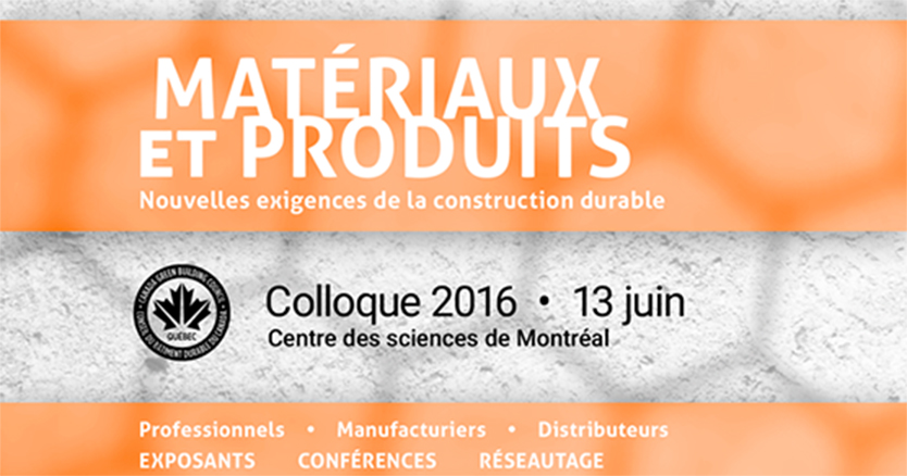 « Le Conseil du bâtiment durable du Canada – Québec lance un appel de conférencières et de conférenciers pour la deuxième édition du colloque Matériaux et produits : Nouvelles exigences de la construction durable qui aura lieu le 13 juin 2016 au Centre des sciences de Montréal.