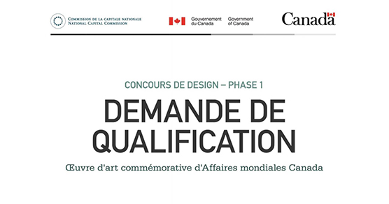 « Le ministère du Patrimoine canadien lance un concours national de design dans le cadre duquel des équipes d’artistes professionnels, d’architectes-paysagistes, d’architectes et d’autres professionnels du design urbain sont invitées à travailler au design d’une œuvre d’art commémorative pour Affaires mondiales Canada.