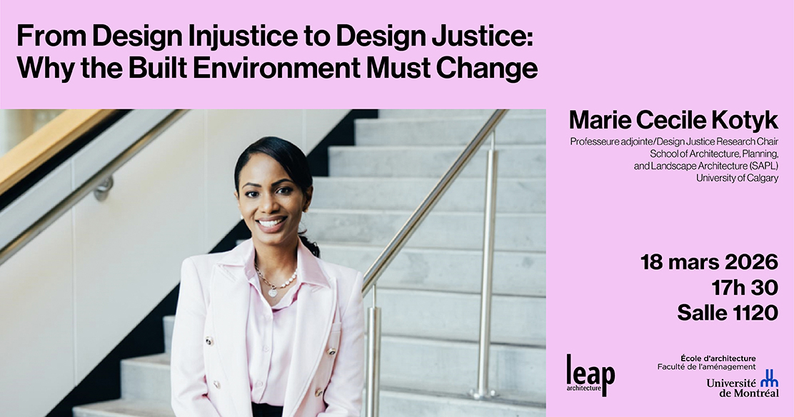 Le mardi 18 mars 2026 à 17h30, à l’amphithéâtre 1120, de l’École d’architecture de l’Université de Montréal.
