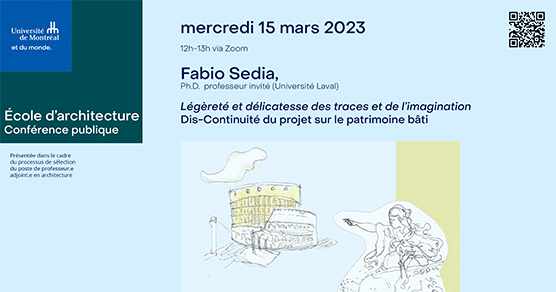 « L’École d’architecture de l’UdeM a le plaisir de vous inviter à une série de cinq conférences publiques offertes via ZOOM dans le cadre du processus de sélection du poste de professeur.e adjoint.e en architecture avec une expertise en intervention du patrimoine bâti.