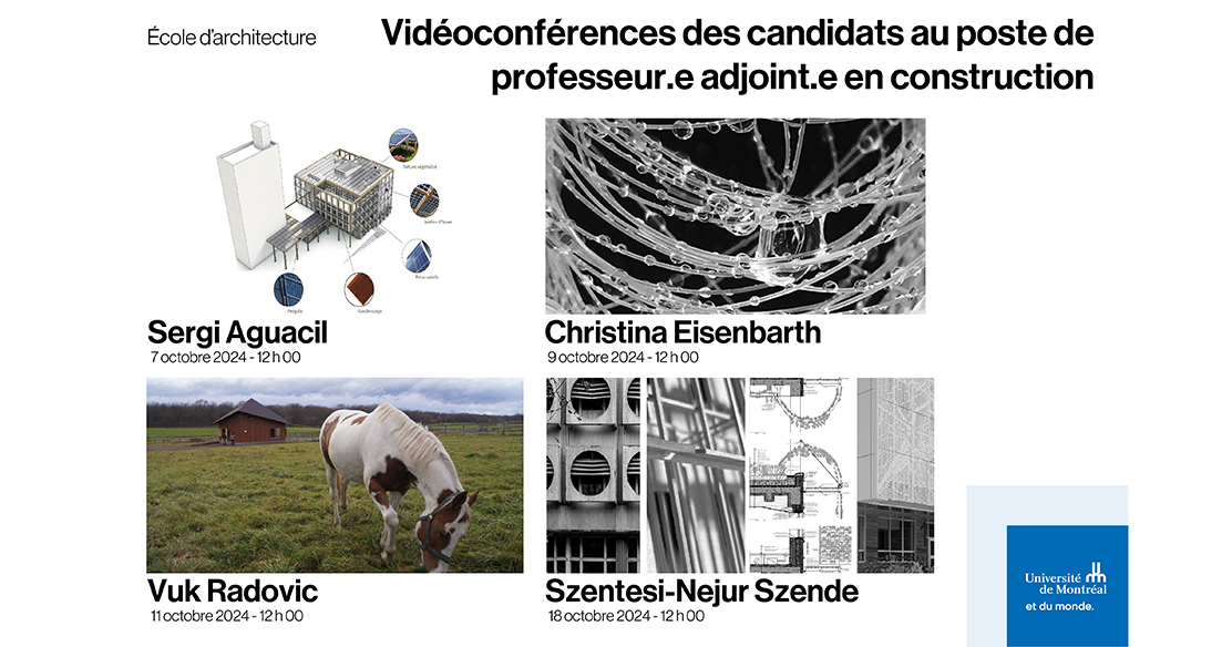 L’École d’architecture a le plaisir de vous inviter à une série de quatre conférences publiques présentées à distance dans le but de vous permettre de mieux connaître les personnes finalistes au poste de professeur.e adjoint.e en architecture avec une expertise en construction.